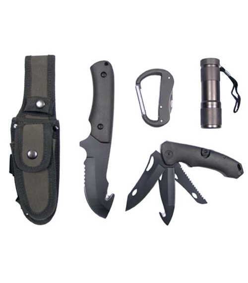 • Tato souprava se skládá z pevného nože, zavíracího nože, karabiny, která je opatřena dalšímy nástroji (nůž, nůžky, šroubovák a otvírák) a duralovou svítilnou (9 LED diod).