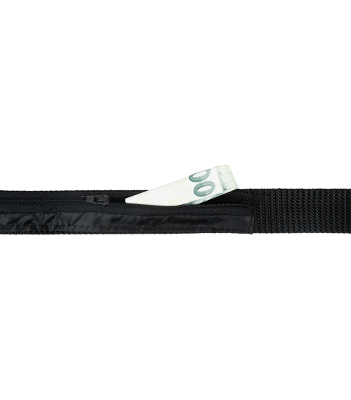 Širší kalhotový opasek s kovovou průvlekovou sponou stříbřité barvy. Jedinečností je vnitřní tajná kapsa, do níž je možné uložit bankovky nebo jiné drobné cennosti a předejít tak jejich ztrátě nebo odcizení.