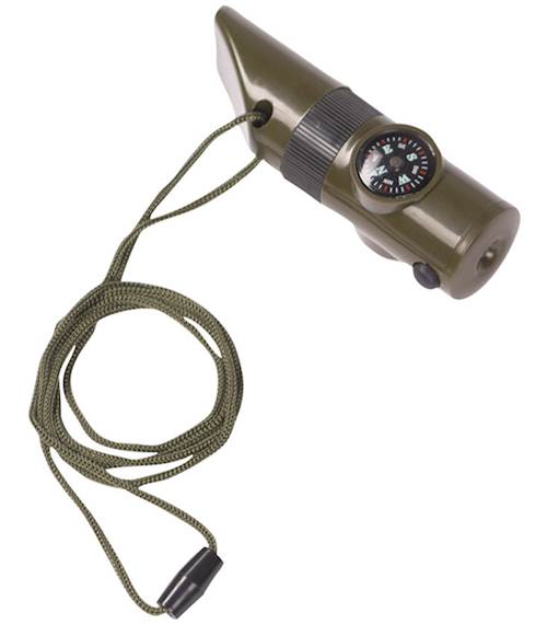 Signální píšťalka s dalšími funkcemi. Včetně šňůrky z polyesteru.