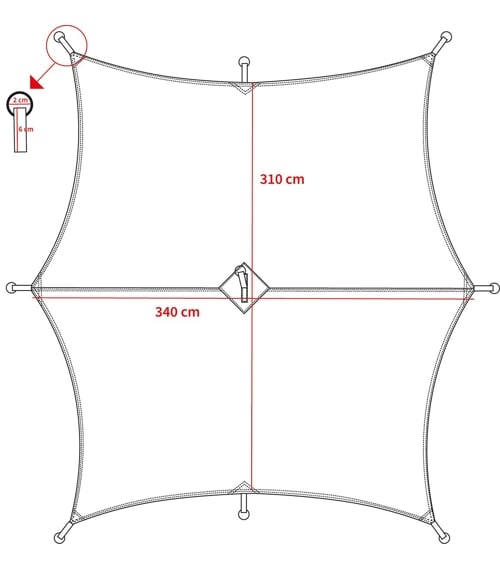 Plachta má 9 poutek s kovovými kroužky, 8 kolíků a 8 kotevních lan. V balení také přepravní taška.
