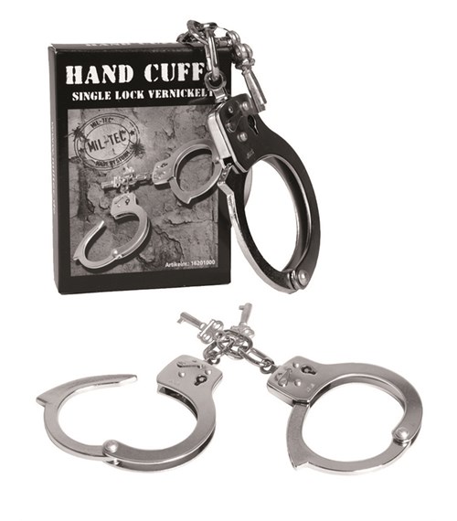 - Klasická, zaklapávací pouta na obě ruce, spojená krátkým řetízkem