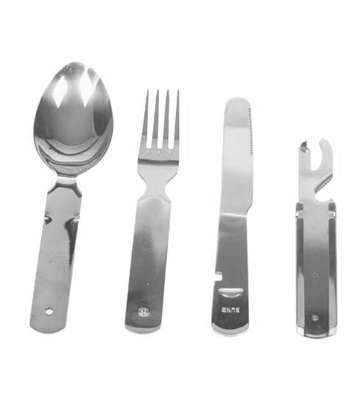 Komplet je vyroben z těžší nerez oceli a obsahuje čtyři části - nůž, vidličku, lžíci a držák, který je zároveň uzpůsoben k otvírání konzerv a korunkových uzávěrů na láhvích