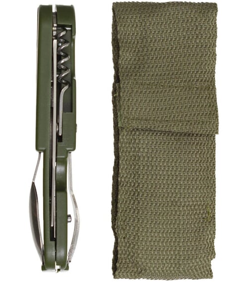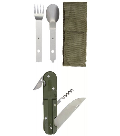 Skládací příborový set. Nůž, vidlička, lžíce. K tomu vývrtka, otvírák lahví a konzerv.