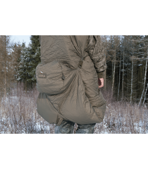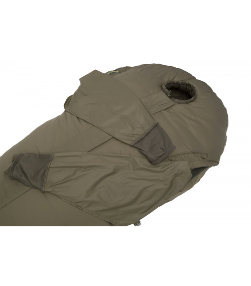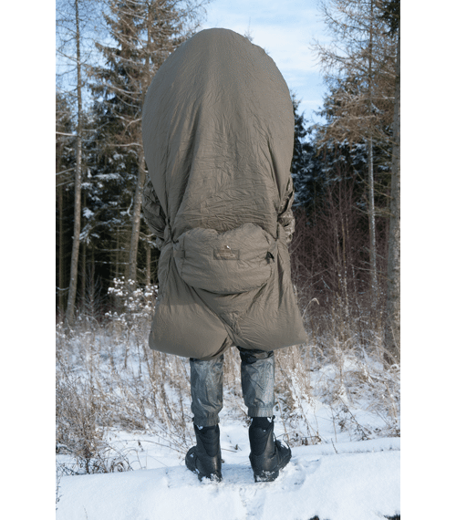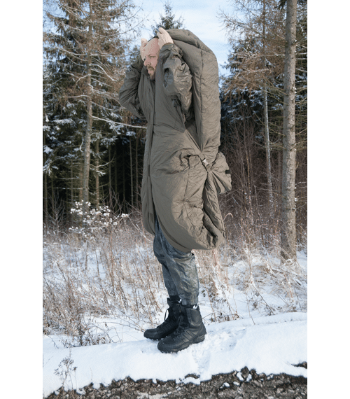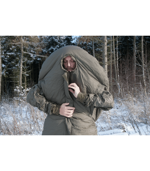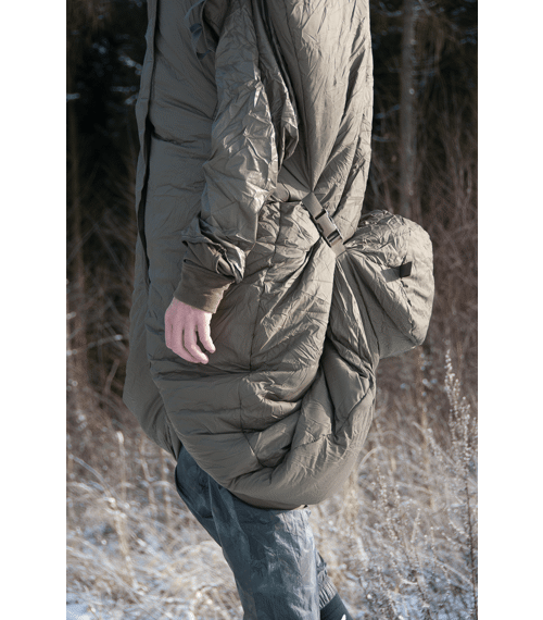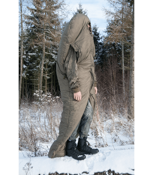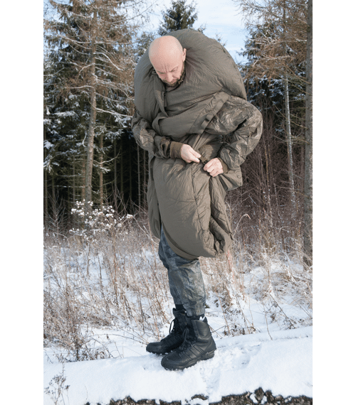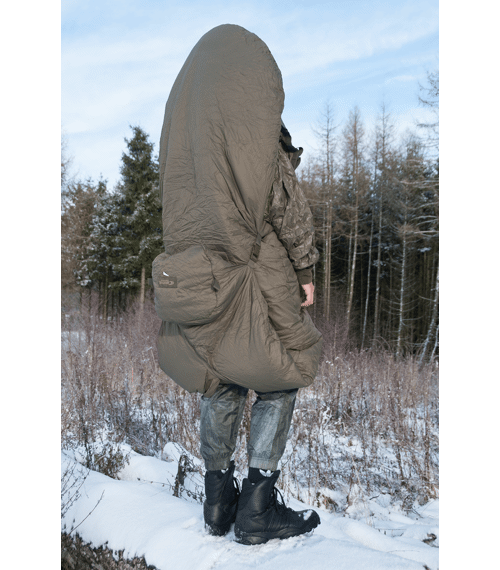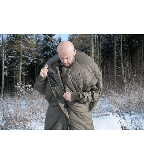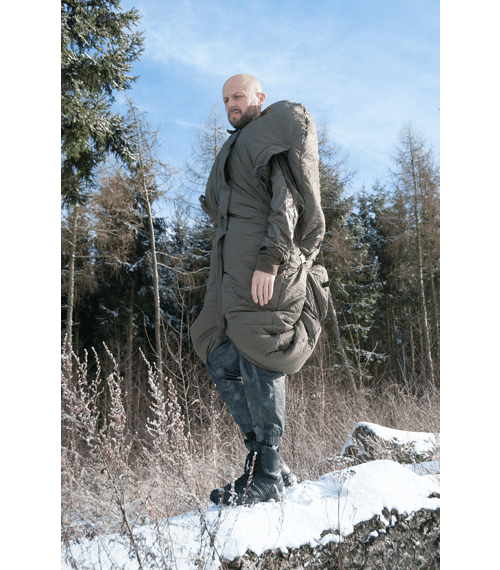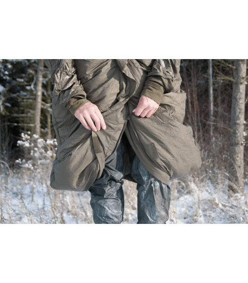 Otevřením spacáku pomocí zipů ve spodní části lze vysunout nohy a ve spacáku se pohybovat jako v kabátu. Rukávy jsou ukryty mezi izolačními vrstvami.