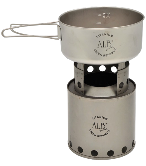 Univerzální vařič typu BushBuddy (v česku také známý pod názvem "dřívkáč") od výrobce ALB v nerezovém provedení. Jako palivo lze použít suché dřevo, trávu, pevný líh, atd. Na vařiči lze uvařit jeden litr vody během 10 minut (za dobrých podmínek, chráněné před větrem a deštem, s poklicí na nádobě).