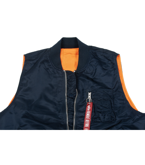 Vesta je oboustranná – vnitřní strana je v kontrastní oranžové barvě, typické pro modely MA-1. Zapínání je řešeno pevným kovovým zipem. Na přední straně se nachází dvě boční kapsy se zapínáním na druky a kapsa na zip na hrudi, doplněná ikonickou stuhou Remove Before Flight. Spodní lem je zakončen pružným nápletem, který zajišťuje dobré usazení na těle.