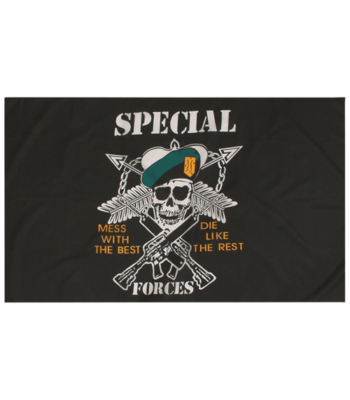 • Vlajka s motivem lebky se zeleným baretem, za lebkou 2 zkřížené šípy, pod ní 2 zkřížené automatické pušky M16